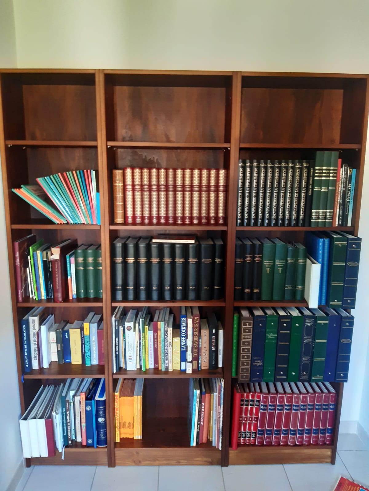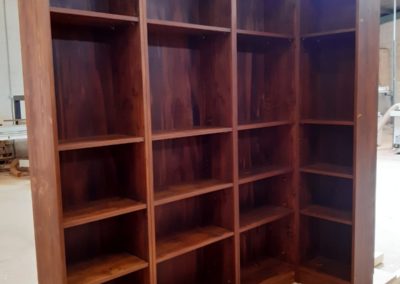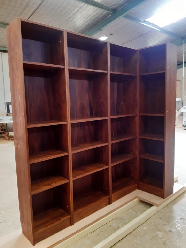 Cette bibliothèque a été réalisée sur mesure afin de s’adapter au mieux à la pièce. Ce meuble en bois comprend de nombreux compartiments permettant une grande capacité de rangement.