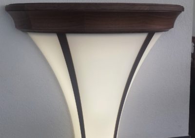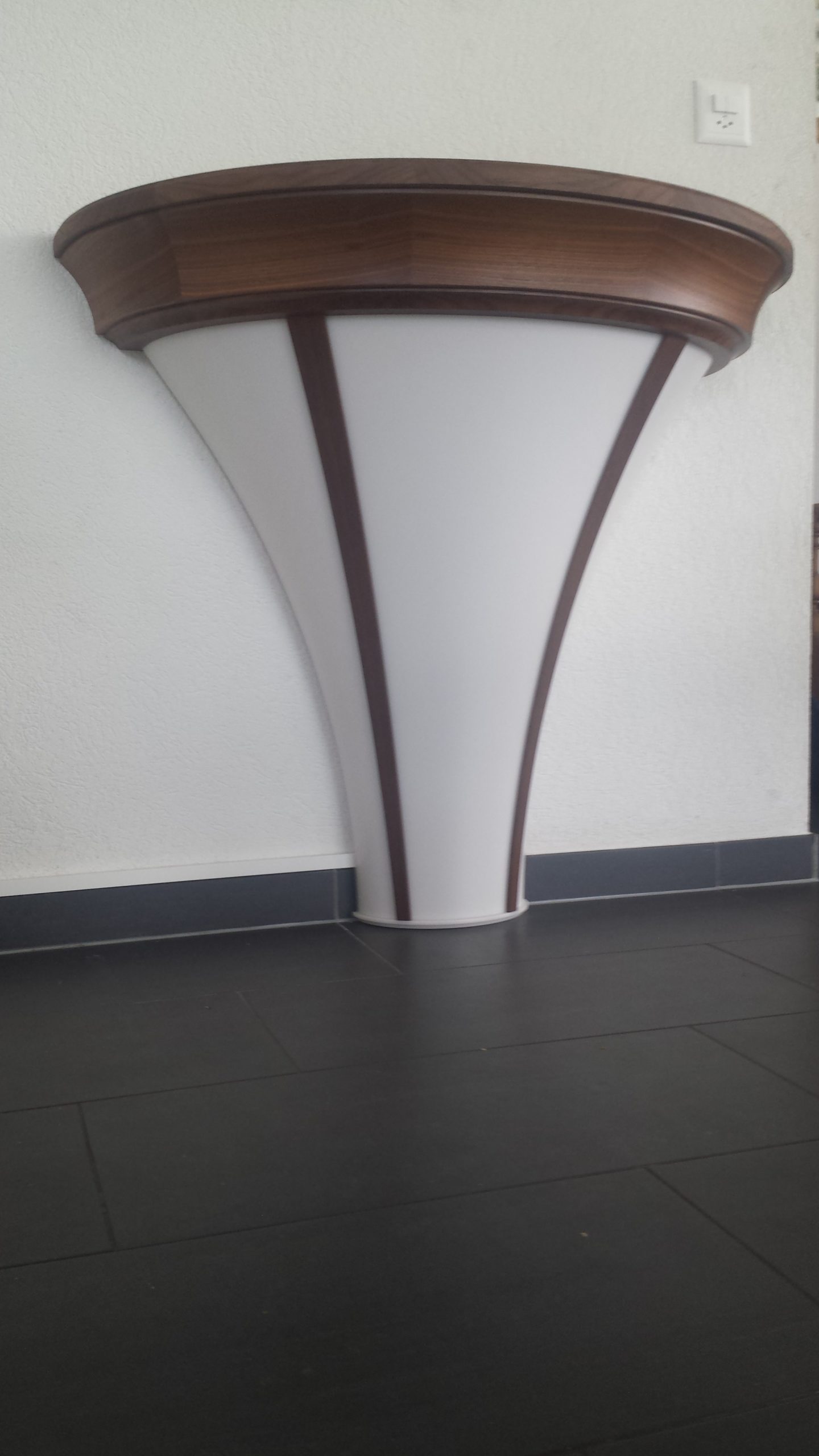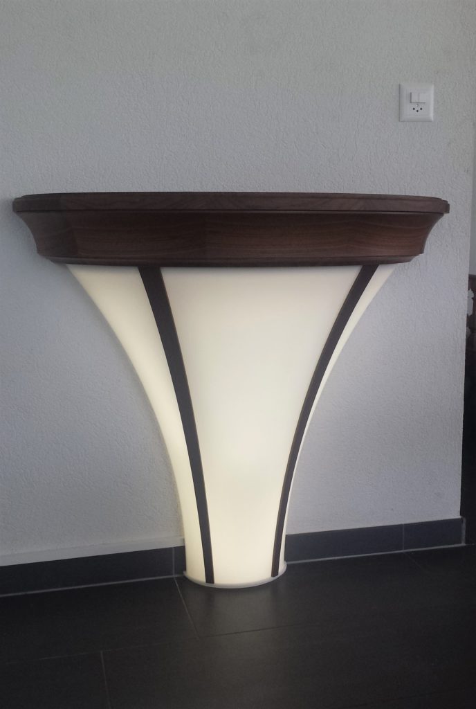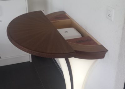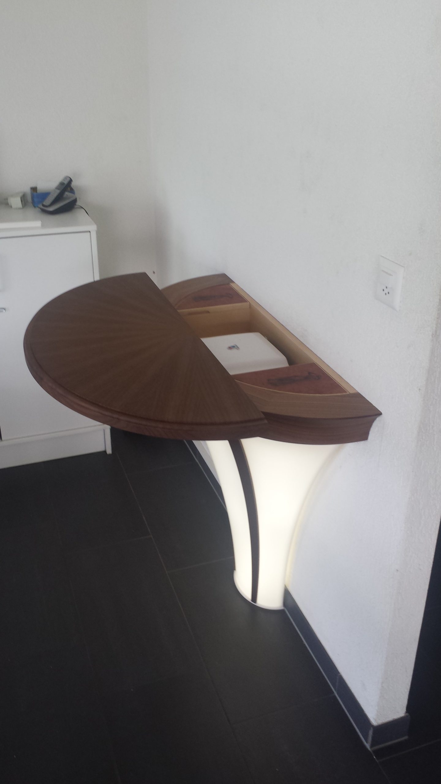 Elégante, cette console en bois massif rétroéclairée apporte du caractère à votre intérieur. Réalisée en noyer, son mélange avec la résine en corian blanc amène de la luminosité. Son rangement dissimulé laisse découvrir sa marqueterie et permet de ranger ses objets. Cette console mise en valeur par son plaquage sur la tablette pourra habiller votre espace tel que votre entrée.