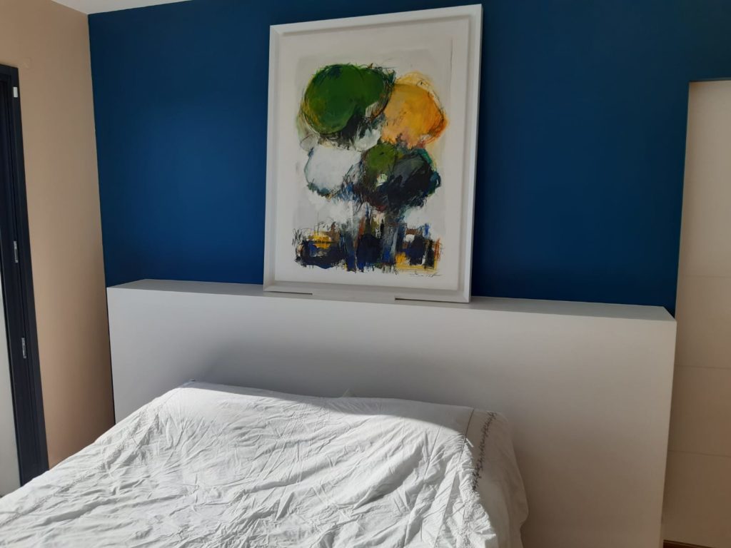 Réalisée sur mesure, cette tête de lit est épurée pour garder une atmosphère apaisante. Pratique, cet agencement permet d’ajouter une touche de décoration à sa chambre.